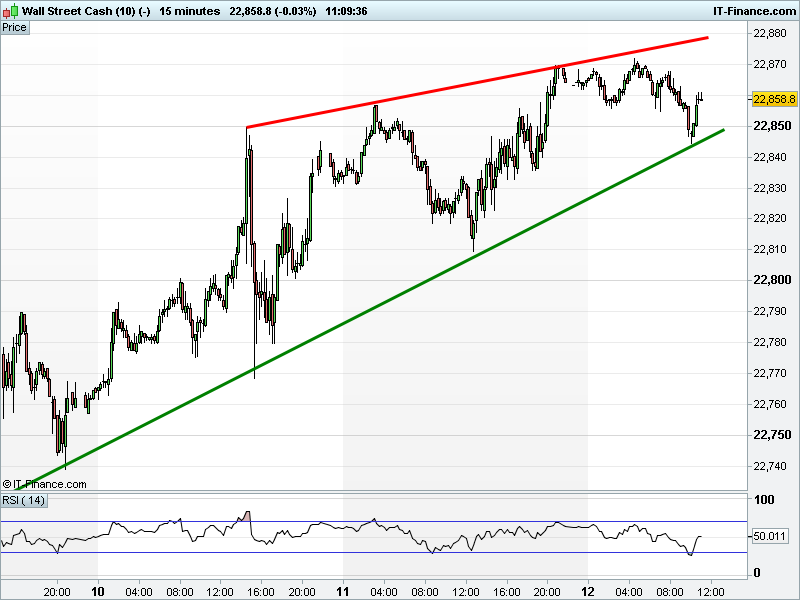 Dow Jones Futures are narrowing into 22900 to complete a 1-month bullish flag. However we are conscious potential for a bearish wedge reversal.