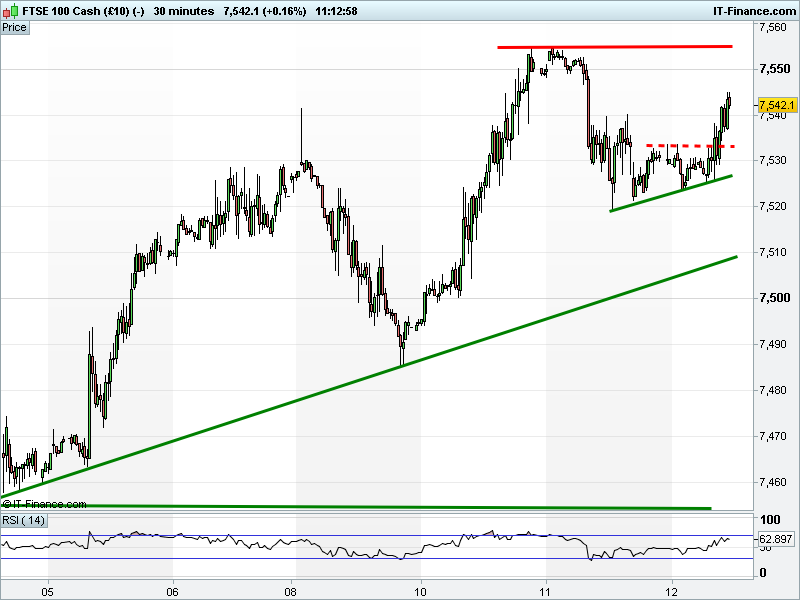 The UK Index 100 is on-track for a retest of recent 7555 resistance. Breakout towards 7600 record highs? Moving averages set-up is bullish.