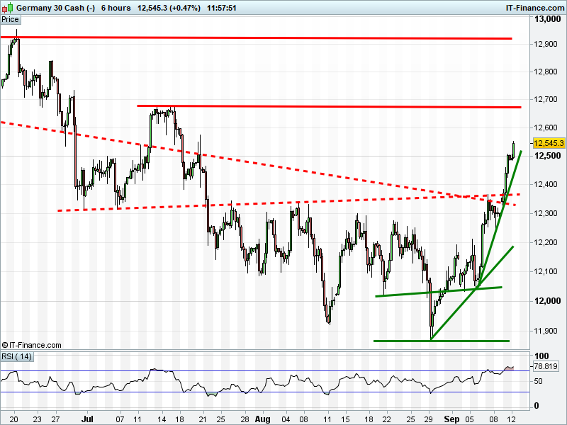 The UK  UK 100 is just the wrong side of breakeven, hindered by GBP strength and being led lower by the likes of RDSb & BP (oil off highs), BATS/ULVR/RB (FX sensitive, defensives being shunned), VOD & SHP (profit taking). These are offsetting positive contributions from BARC/LLOY/RBS (strong UK inflation, threat of BoE rate rise), AHT (hurricane beneficiary; temp power provider) and PRU (hurricane not as bad as it could have been).