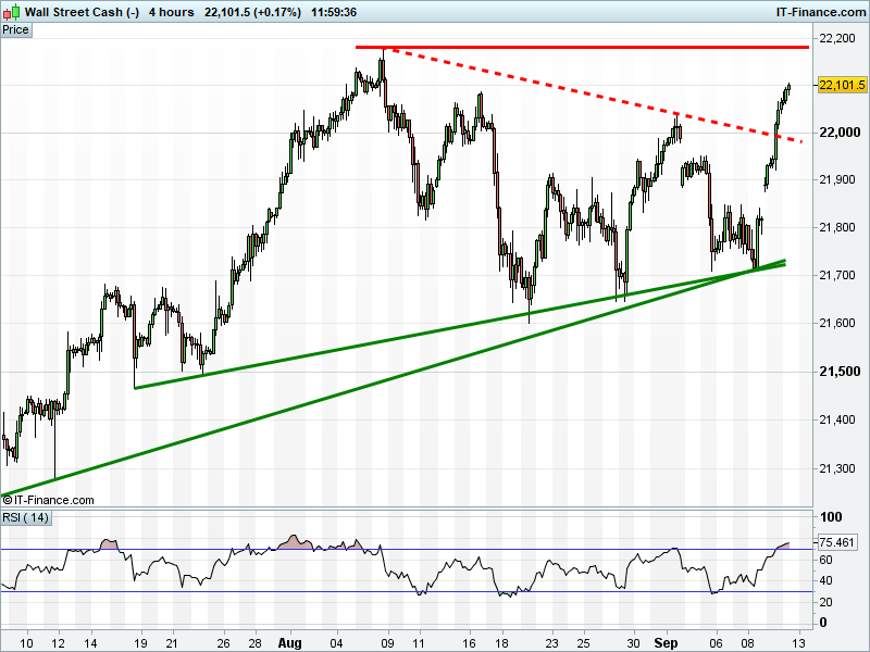 After yesterday’s breakout, Dow Jones Futures are half-way towards a revisit of 22180 record highs.