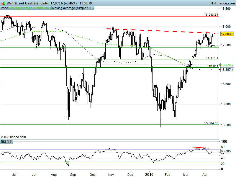 The Dow Jones has met resistance again at oct/nov levels, having come back from there overnight. Higher lows since Tuesday put a breakout on the cards, with the daily RSI pointing back up in bullish territory.