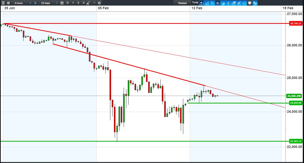 The UK Index 100 is stuck below falling highs resistance at 7200. The DAX 30 is back below 12300 having succumbed to falling highs resistance. Dow Jones Futures are back below 24500, hampered by falling highs. Gold is at a $1330 crossroads its rebound channel having encountered Jan falling highs resistance.