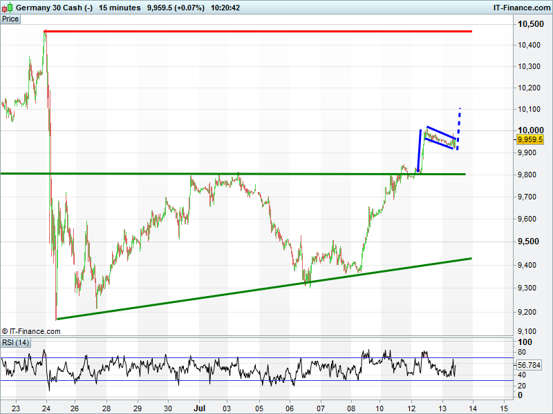 The DAX30 rebounding off 9920 means it could be in the midst of a bullish flag pattern back to 10000 and on towards 10100.