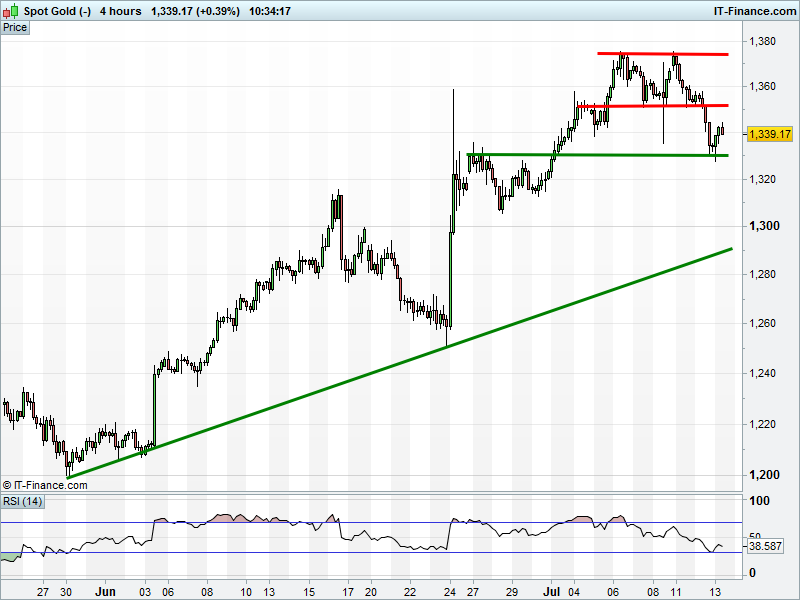 Gold has bounced from $1330 after breaking down at $1350 from a bearish double-top. Back to $1300? Signal for risk-appetite?