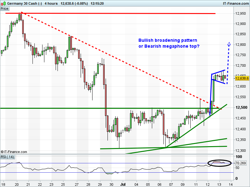 The DAX 30 is in a broadening pattern just shy of 12650 that could take it 150 points either way. Note 4-hourly RSI overbought