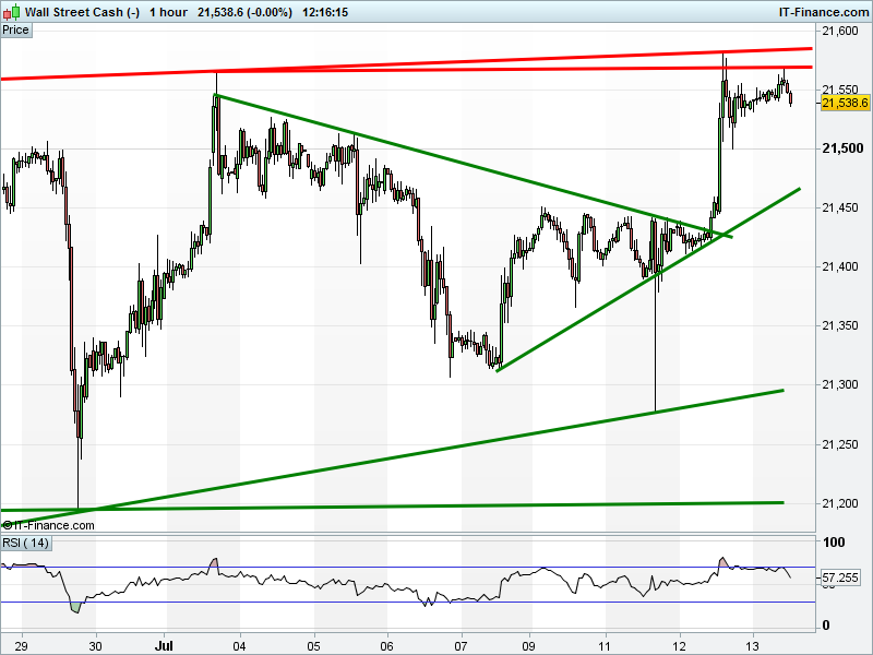 Dow Jones Futures has turned back from 21550 having failed to match yesterday’s fresh record high.