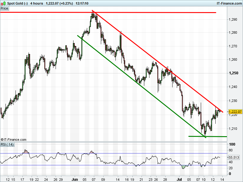 The UK Index 100 is holding above 7400 with potential for bullish triple bottom reversal complemented by a bullish flag towards 7500. The DAX 30 is in a broadening pattern just shy of 12650 that could take it 150 points either way. Dow Jones Futures has turned back from 21550 having failed to match yesterday’s fresh record high. Gold has failed to overcome June falling highs resistance at $1225 in a clear 5-week falling channel.