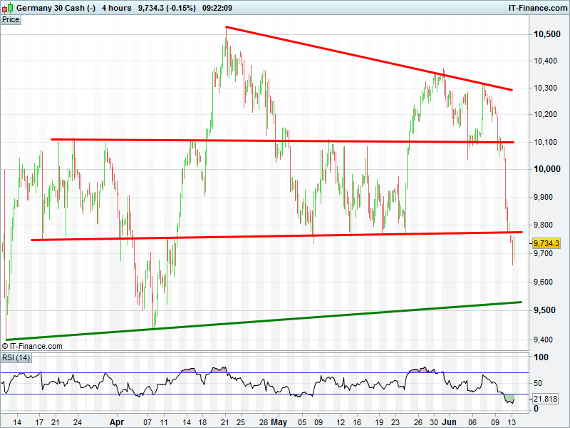 The DAX30 has bounced back above 9700 but already found resistance at what is likely now support-turned-resistance at 9775 following the late Friday breakdown. Is a breakout possible, or is this merely a pause before another downleg towards 9500? Note the 4-hourly RSI oversold like the UK Index .