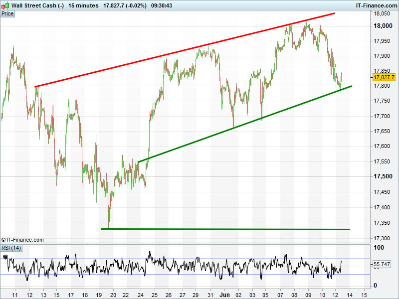 Wall Street/Dow Jones futures have made a bullish bounce from 3-week rising lows at 17800 which puts it in a rising channel that could take it back to 18000. Any breakdown would likely see a revisit of June lows around 17700.