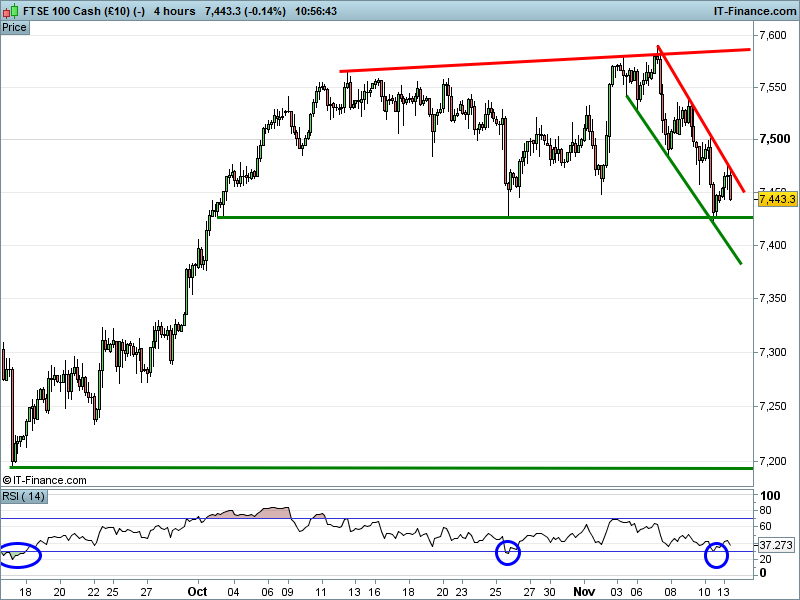 The UK Index 100 is retreating from 7475 falling highs resistance although remains positive on the day.