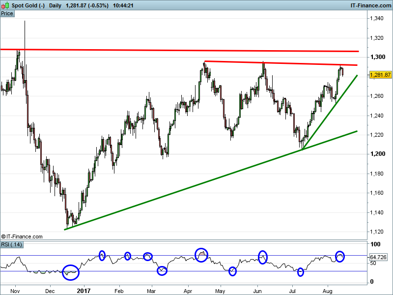 Gold has fallen to lows of $1280 as safe-haven demand falters. Note, RSI has retreated from overbought