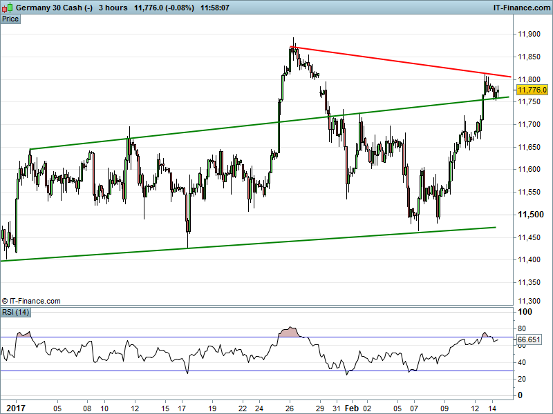 Equity markets are flat to positive as investors cautiously wait for a key address to Congress from Fed Chair Janet Yellen this afternoon, while mixed bag of macro data for both the UK and the Eurozone has resulted in a developing tug of war in FX markets. Sterling was the first to fall after UK CPI data came in softer than expected, boosting the majority foreign earning UK 100 , before a marginally weaker flash Eurozone GDP reading saw the Pound halt its sell off, capping the UK Index rally just shy of fresh one month highs of 7300. All eyes will be on whether Yellen rules out a March rate hike or reiterates the Fed’s official forecast of 3 rate hikes in 2017, with significant ramifications for the US dollar.