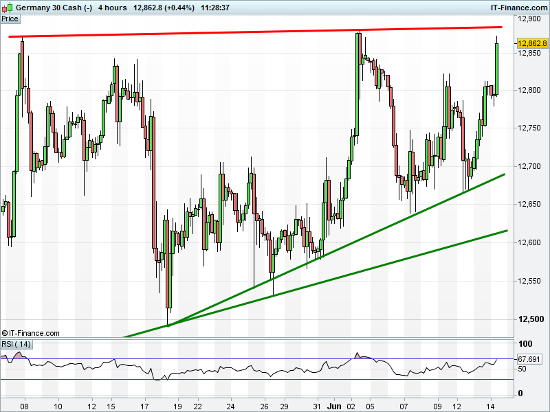 The DAX 30 has almost completed a bullish flag pattern to re-test 12880 record highs.