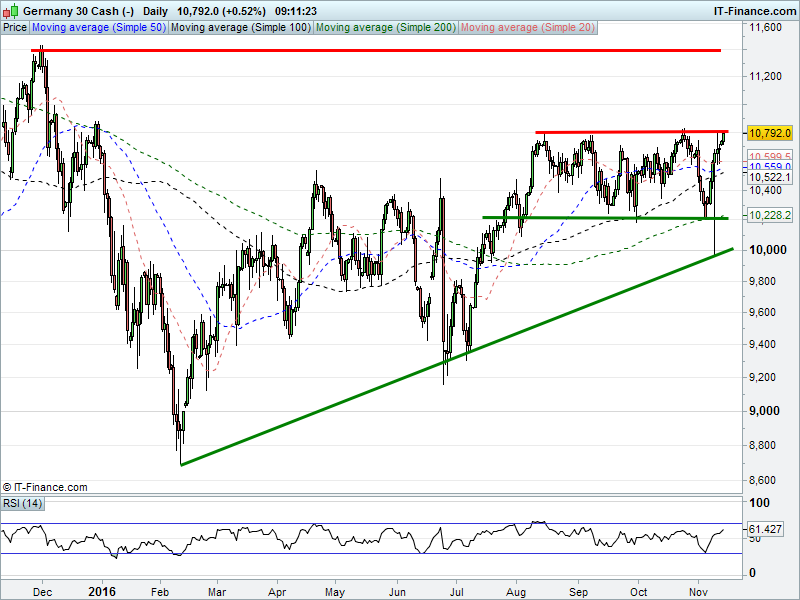 The DAX 30 is teasingly close to a channel breakout at 10800. A strong USD/weaker EUR would help exporters. Or will the index turn back towards the channel floor?
