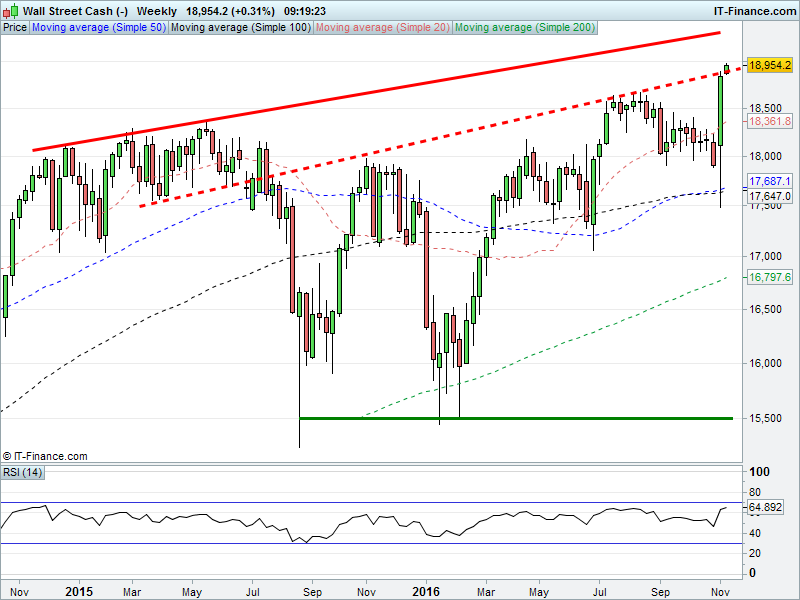 Dow Jones Futures continues to post fresh record highs, now within touching distance of 19000. Already testing intersecting resistance? Onwards and upwards, helped by The Donald?