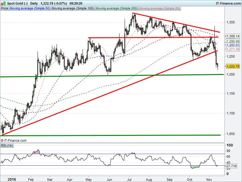 Gold is suffering from increased US rate rise expectations and a stronger USD coupled with less fear of Trump. Back to Back to $1200 or lower? Or fear to return and the safehaven rebound?