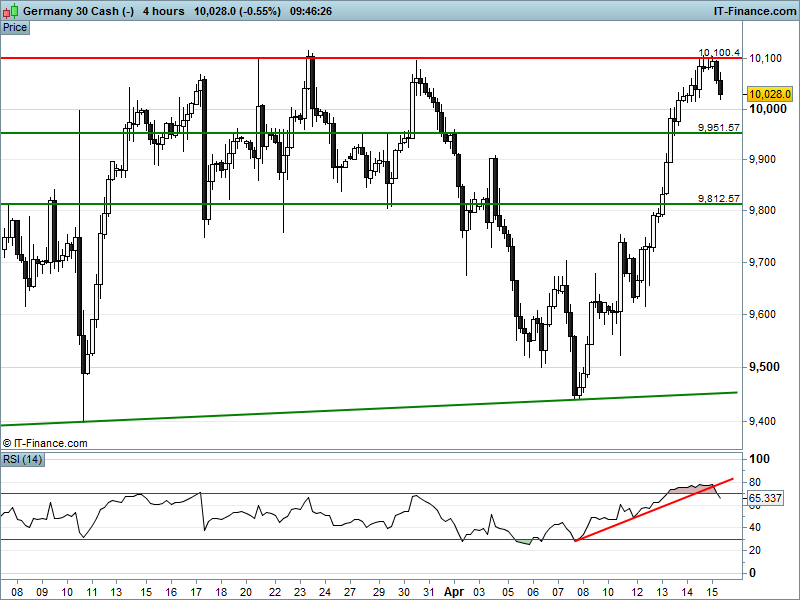 The DAX is also turning back from 10,100 with its RSI having broken a rising trend line and come back from overbought. The index has found support 10018 for now.