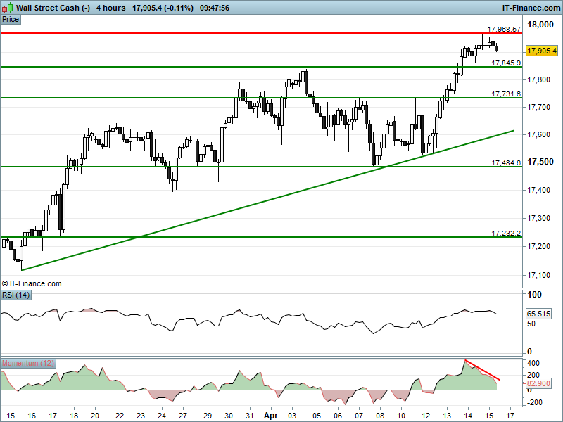 The Dow Jones is still battling those Oct/Nov resistance levels and has found support this morning at 17900. Note momentum in sharp decline and the RSI back from overbought. Potential for 17845 by end of play, given the US starts trading at 2.30pm.