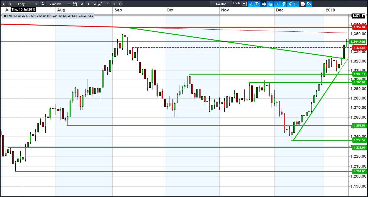 The UK Index 100 holds above 7765 January rising support. The DAX 30 trades a new 13175-13300 channel. Dow Jones Futures continue their northerly step-up, now flirting with 26000. Gold has broken above $1335 resistance.