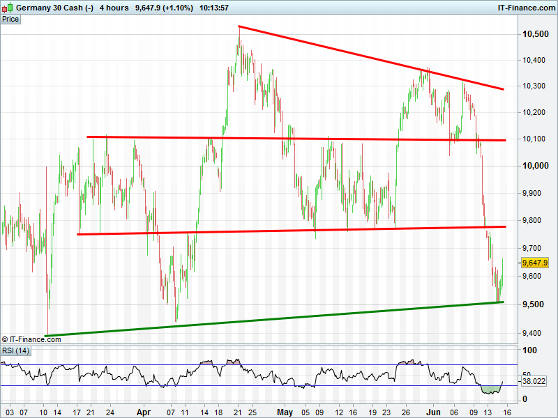The DAX30 continues its bounce from 9500 thanks to shallow rising support. Can 9800 be regained? Note the RSI has made a bullish recovery from oversold, just like the UK Index .