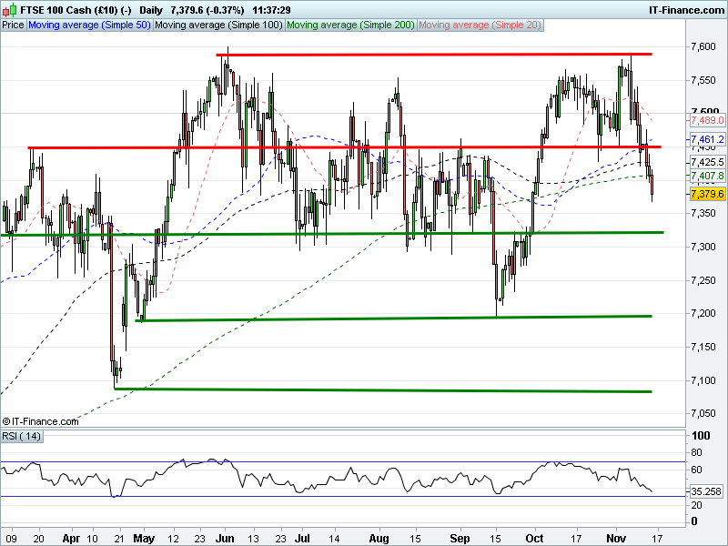 The UK Index 100 has extended its steep downtrend below 7400. Breach of 200-day moving average. RSI not yet oversold.