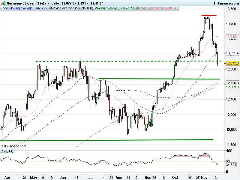 The DAX 30 has broken below 12900. RSI not yet oversold. Steep falling channel.