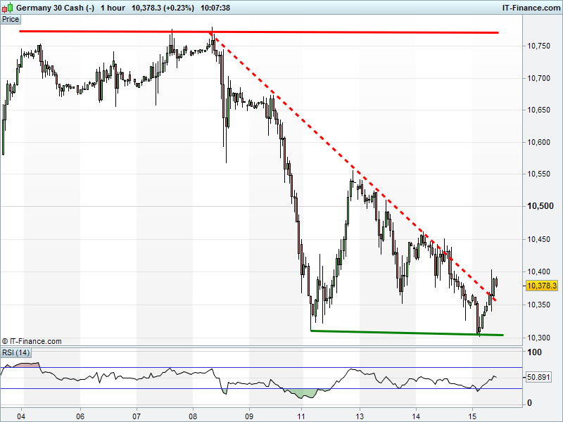 The DAX 30 has broken beyond 6-day falling highs. Rising lows since overnight but yet to regain 10400.