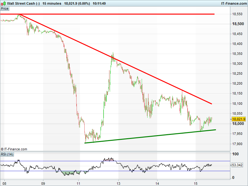 Dow Jones futures are holding shallow rising lows at 18000, but remain hindered by steeper falling highs.