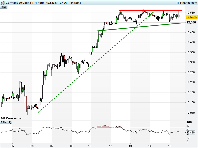 The DAX 30 sits 12500-12560, potentially consolidating via another bullish flag before another up-leg