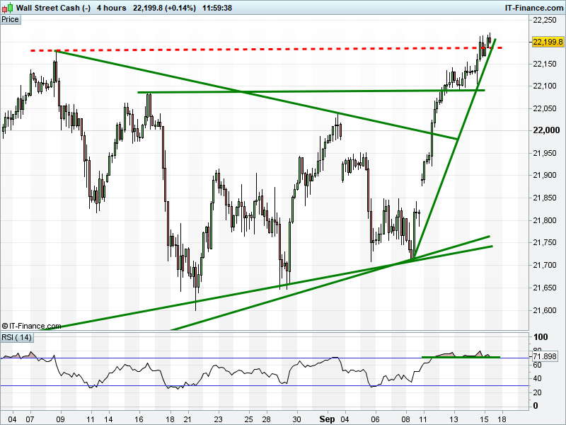 Dow Jones Futures trade fresh all-time highs 22,200. RSI bullish.