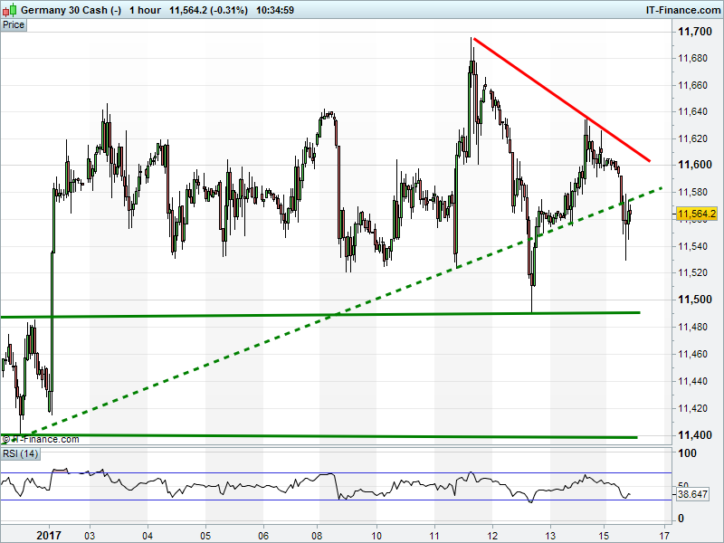 The DAX 30 is back below 11580 rising support that dates back to mid-December.  Can It break back above like last Thursday, or is it set to fall further?