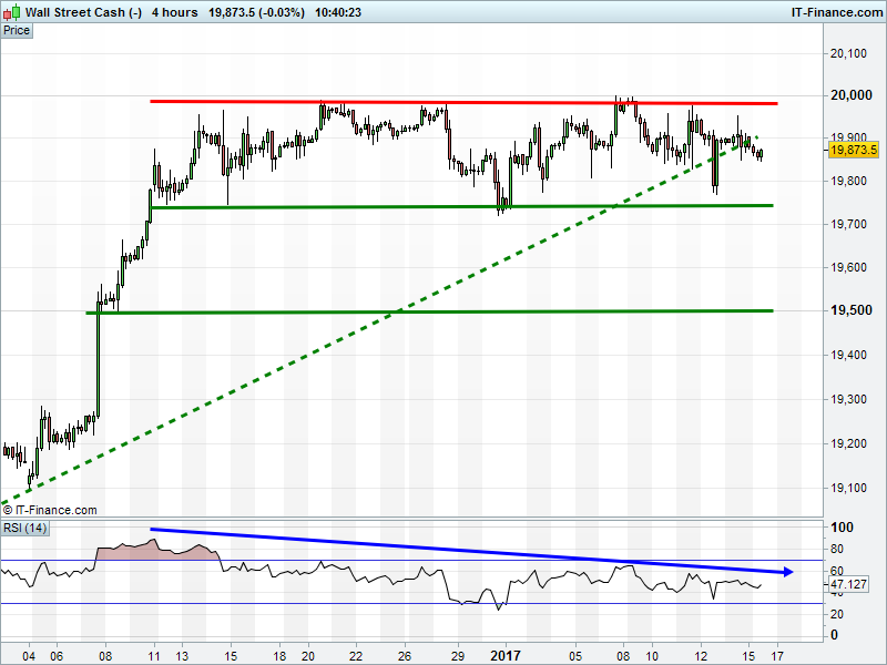 Dow Jones Futures remain rangebound 19740-19980, but impetus is lacking on this market holiday and with the new President’s inauguration looming.  RSI still in decline, both daily and 4-hourly.