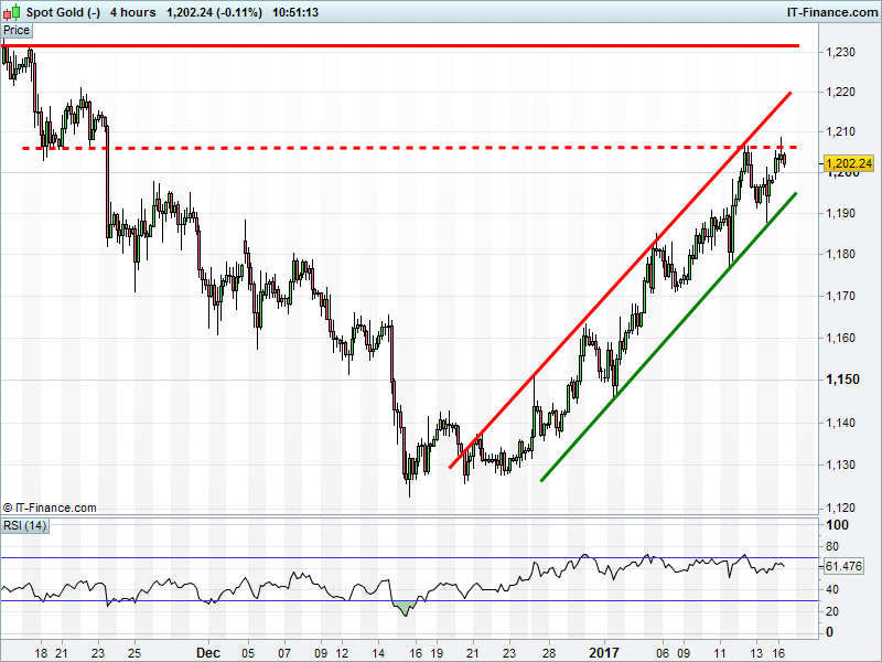 The UK 100  is holding its December uptrend at 7340, but some hints of fatigue are creeping in. The DAX 30 is back below 11580 rising support that dates back to mid-December. Dow Jones Futures remain range-bound 19740-19980, impetus lacking on this market holiday and with the new President’s inauguration looming. Gold’s 2017 uptrend is still valid, testing last Thursday’s $1206 highs but held back by unwelcome USD strength.