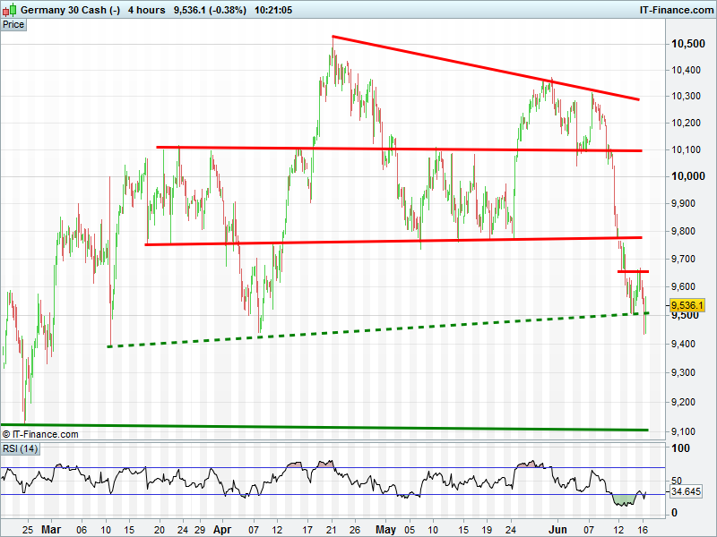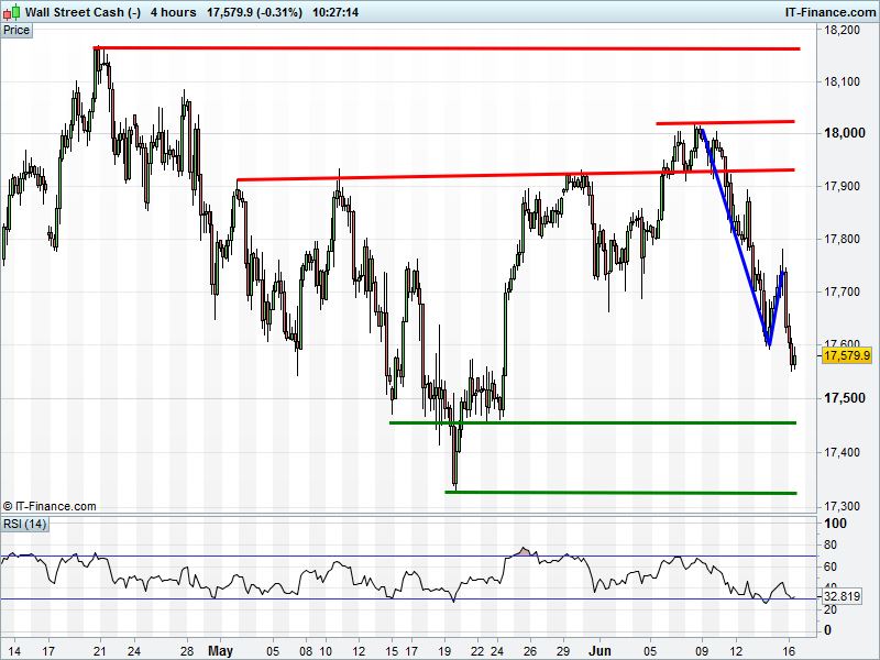 Wall Street/Dow Jones futures are off their 17550 lows but – like the UK Index -) look in the midst the a 400pt retreat to May lows 17325. This via a bearish flag pattern that would repeat the declines we just saw from 18000 to 17600.