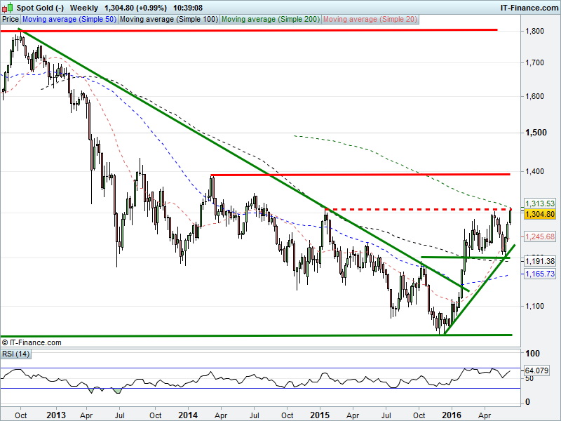 The UK 100 has bounced from a test of 5900 support but resistance at 5940 keeps it within a 24-hour falling channel. 400pt bearish flag on the cards? The DAX30 is back above 9500, but struggling to get beyond 9550. Bearish flag in the making? Wall Street/Dow Jones futures are off their 17550 lows but look in the midst of a 400pt bearish flag retreat to May lows 17325. Gold has made it to fresh 2016 highs (22-month highs, like the Yen) thanks to a weaker dollar, risk aversion and safe haven demand.