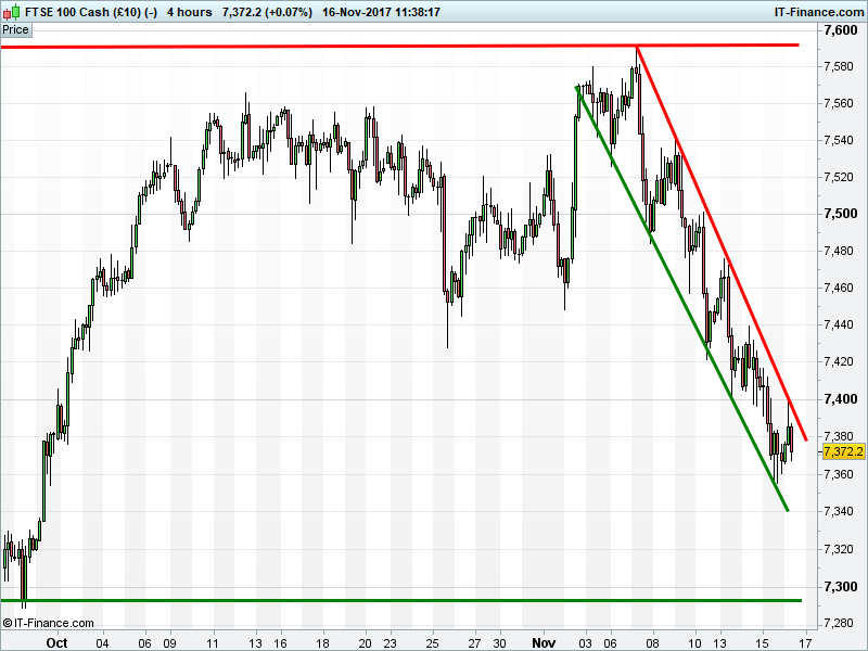 The UK Index 100 bounce has already been checked by falling highs resistance at 7400. Another bearish flag lower?