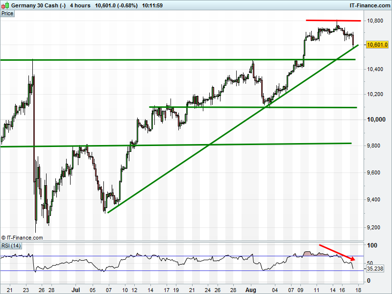 The DAX 30 sell-off from 14-month falling-highs resistance at 10800 has found support at 10580, but could the sell-off continue to 10480? RSI still not technically oversold.