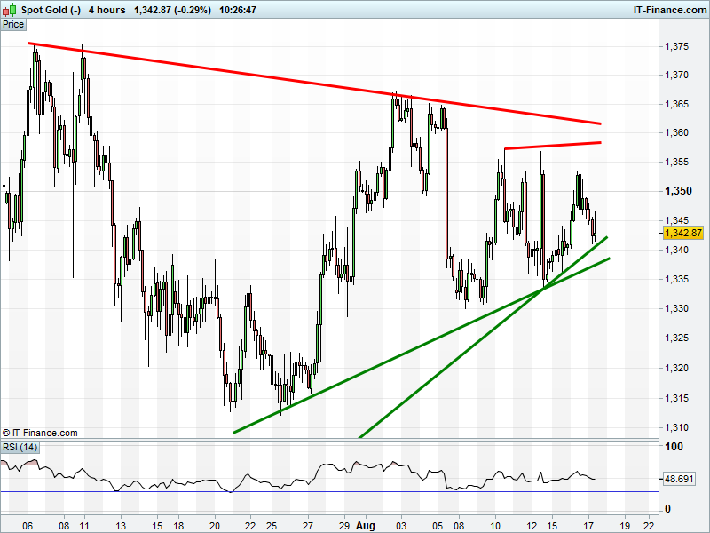 Gold is holding above rising support at $1340 in a narrowing pattern, still hostage to USD moves in run-up to the Fed minutes this evening.