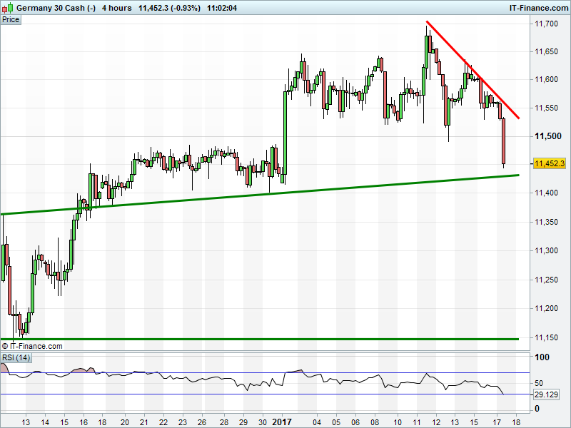 The DAX 30 is headed back towards intersecting 1-month support at 11430. Bounce or breach?