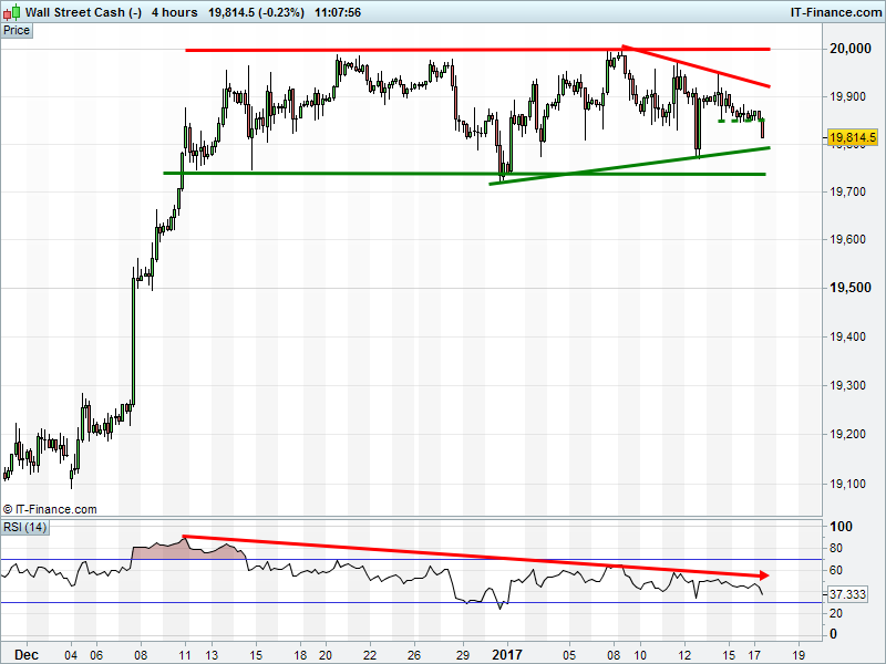 Dow Jones Futures have broken below Friday’s lows still range-bound 19800-19900 (narrowing range), awaiting traders’ return. 2017 rising low support still valid? RSI still in downtrend – negative divergence.