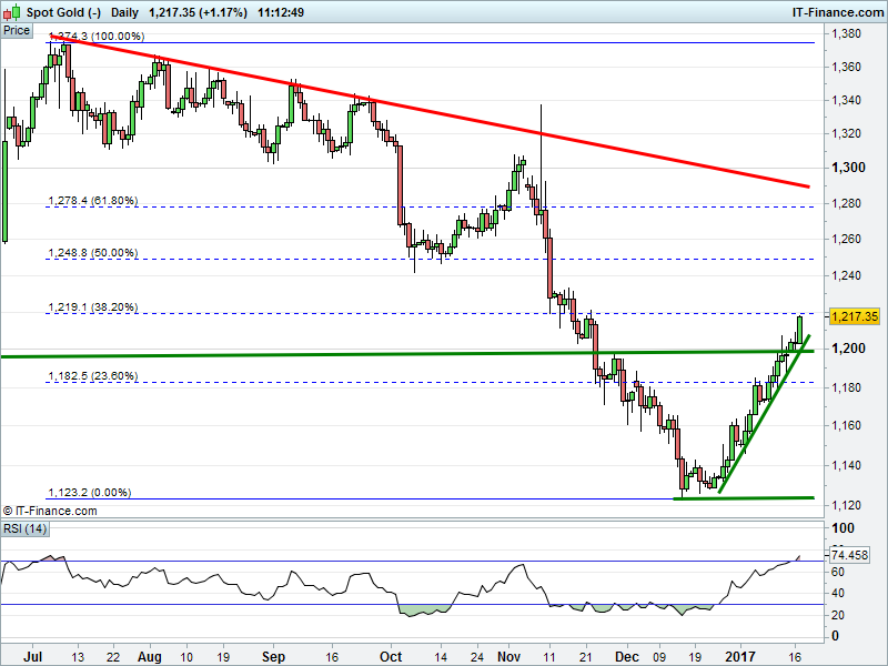 The UK 100 is testing 7300 having ended its winning streak and breached 2017 rising support. Was that the top? The DAX 30 is headed back towards intersecting 1-month support at 11430. Bounce or breach? Dow Jones Futures have broken below Friday’s lows still range-bound 19800-19900, awaiting traders’ return. Gold’s breakout at $1200 has extended to $1218 thanks to USD weakness, although Fibonacci resistance is a hurdle.