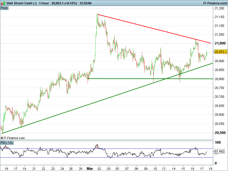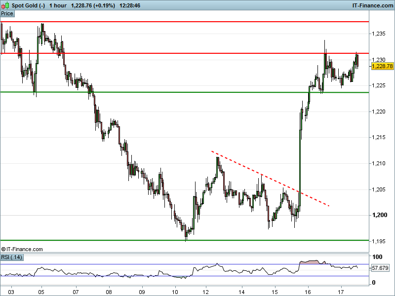 The UK Index 100 has pulled back after a brief flirt with yesterday’s 7445 highs, however remains firmly above 7425. The DAX 30 has to overcome 12100 for a return to last week’s almost 2-year highs. Dow Jones Futures are holding above rising lows support at 20900. 21000 is the next target for a return to all time highs. Gold is struggling to overcome $1231 as it looks to continue its Fed-inspired rally to fresh March highs.
