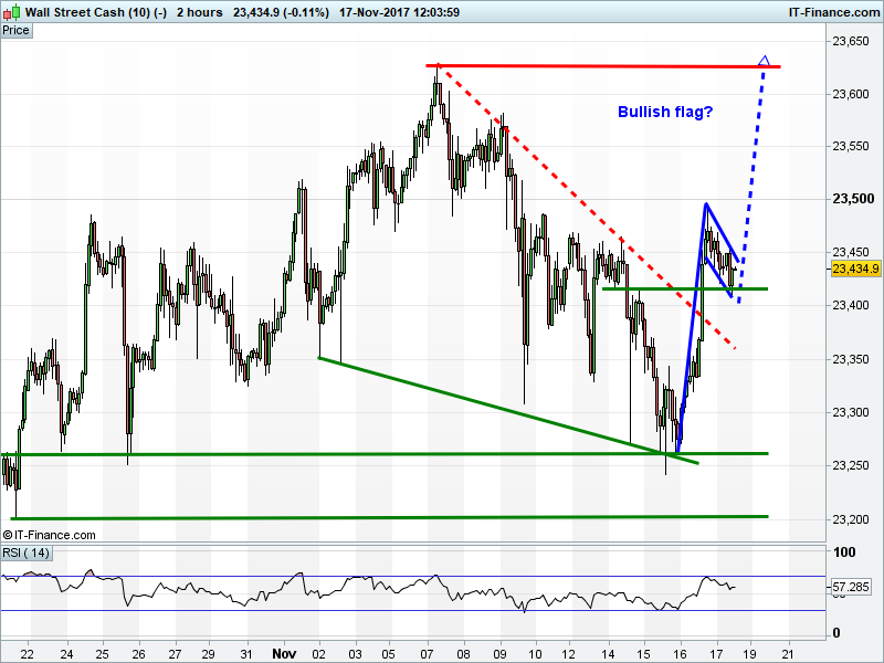 The UK Index 100 is making another bullish test of 7400. The DAX 30 has found support above 13000, potentially in a bullish flag. Dow Jones Futures is consolidating before a potential bullish flag. Gold remains range-bound $1275-1290.