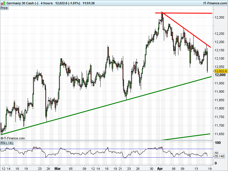 The DAX 30 is trending back towards 2-month rising support at 12000