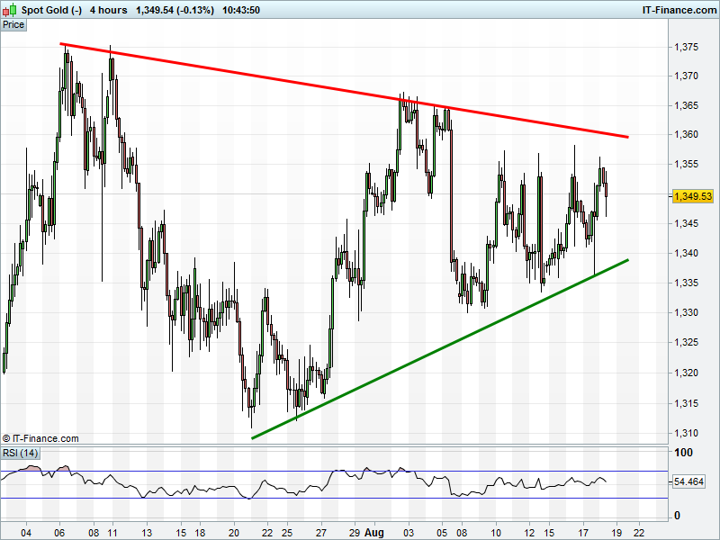 The UK 100 has found support at 6870 although remains in a downtrend since Monday’s highs. The DAX 30 is still managing to hold its July uptrend at 10570, but also remains in a downtrend for the week. Dow Jones futures remain in recovery mode from yesterday’s lows. A breakout at 18600 could ignite a very bullish signal. Gold’s narrowing trading range is unchanged at $1340-1355.