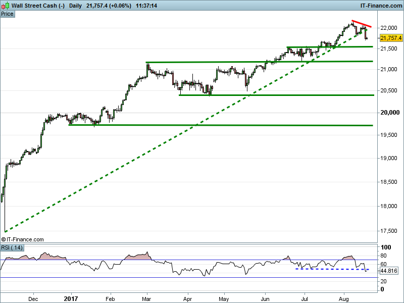 Dow Jones Futures remain below 21,800 having broken their post-election uptrend overnight. Note RSI fallen below 50 for first time since May.