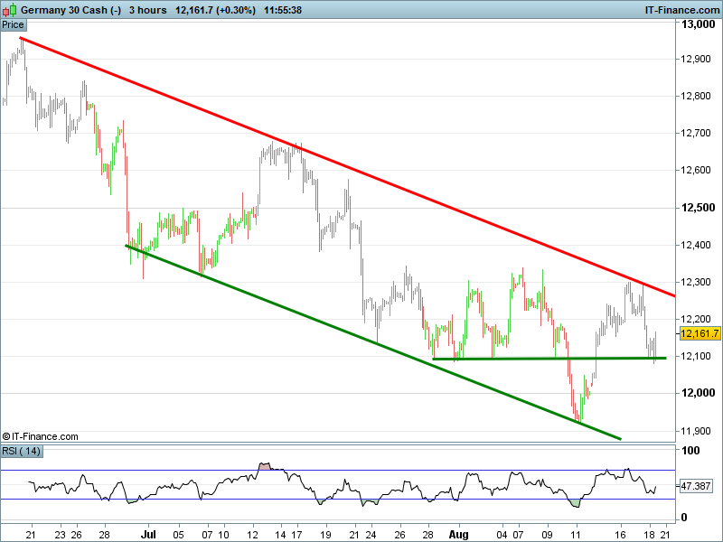 The DAX 30 is falling from the ceiling of its 2-month downtrend, however survives a test of 12,100 support.