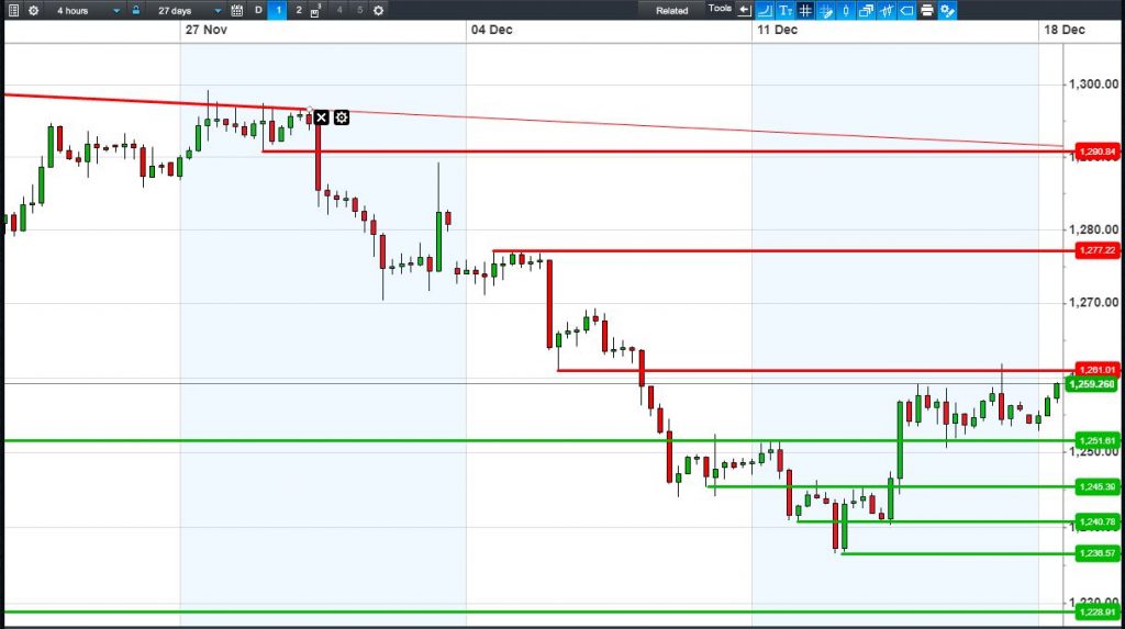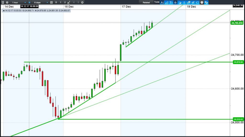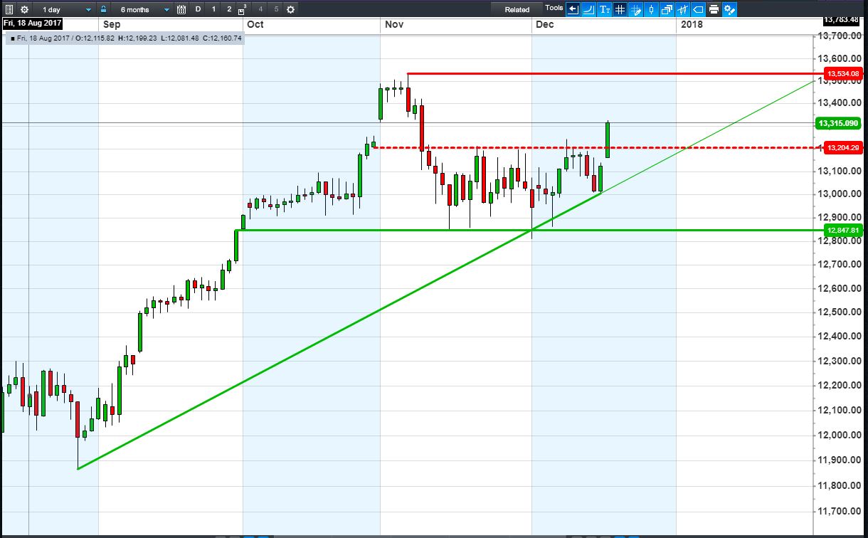 The UK Index 100 is making a bullish test of its recent channel ceiling at 7525. The DAX 30 has broken above recent 13200 highs. Dow Jones Futures trade fresh record highs 24800. Gold is close to another bullish test of $1262.