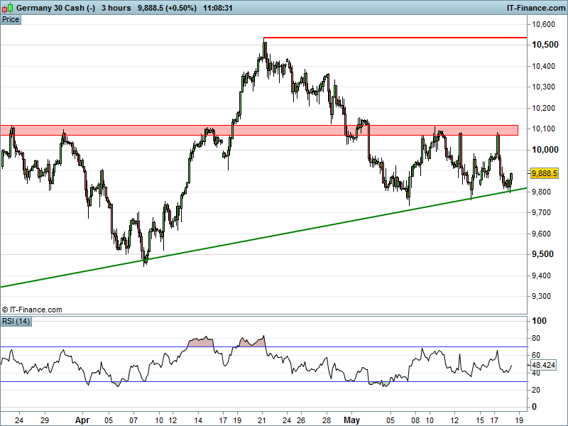 In summary, the UK 100 ‘s rising support line from Friday’s 6060 low is still holding, though subject to frequent tests; the DAX30 has made an encouraging bounce confirming a trend of rising lows since 6 May; Wall Street/Dow Jones futures are consolidatingaround the neckline of a potential 2.5mth bearish H&S reversal. Gold is still testing its own trend of rising lows on a stronger USD.