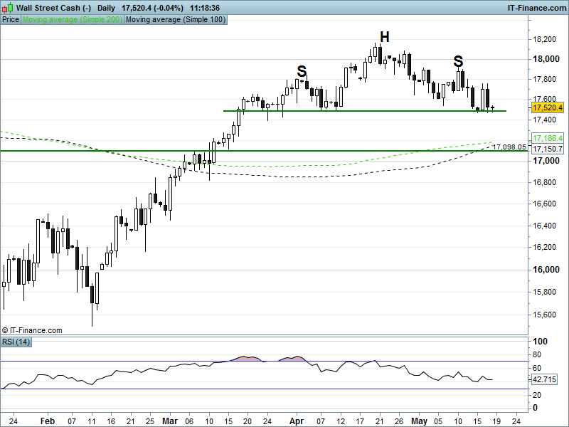 Dow Jones futures are undecided on direction today, with support at the neckline of a 6-week bearish head & shoulders top formation – a break below which could see the index retreat further towards the 200-day MA 17200.